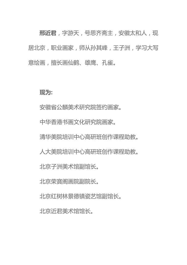 邢近君,字游天,号思齐斋主,安徽太和人,现居北京,职业画家,师从孙其峰,王子洲,学习大写意绘画,擅长画仙鹤、雄鹰、孔雀。现为:安徽省公麟美术研究院签约画家,中华香港书画文化研究院画家,清华美院培训中心高研班创作课程助教,人大美院培训中心高研班创作课程助教,北京子洲美术馆副馆长,北京荣寶阁画院副院长,北京红树林景德镇瓷艺馆副馆长,北京近君美术馆馆长。
