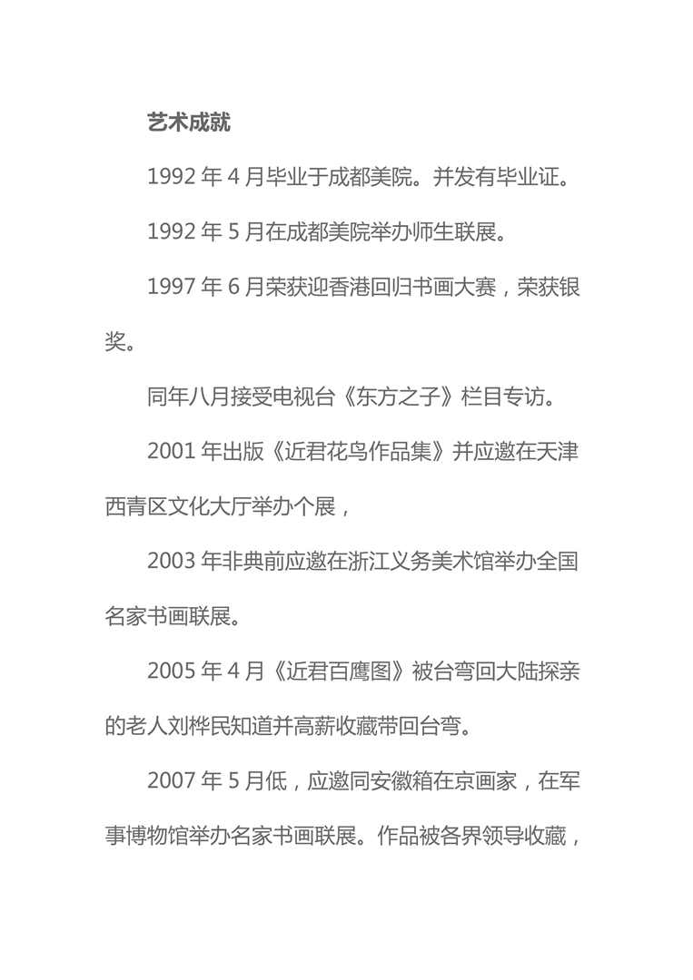2001年出版《近君花鸟作品集》并应邀在天津西青区文化大厅举办个展,