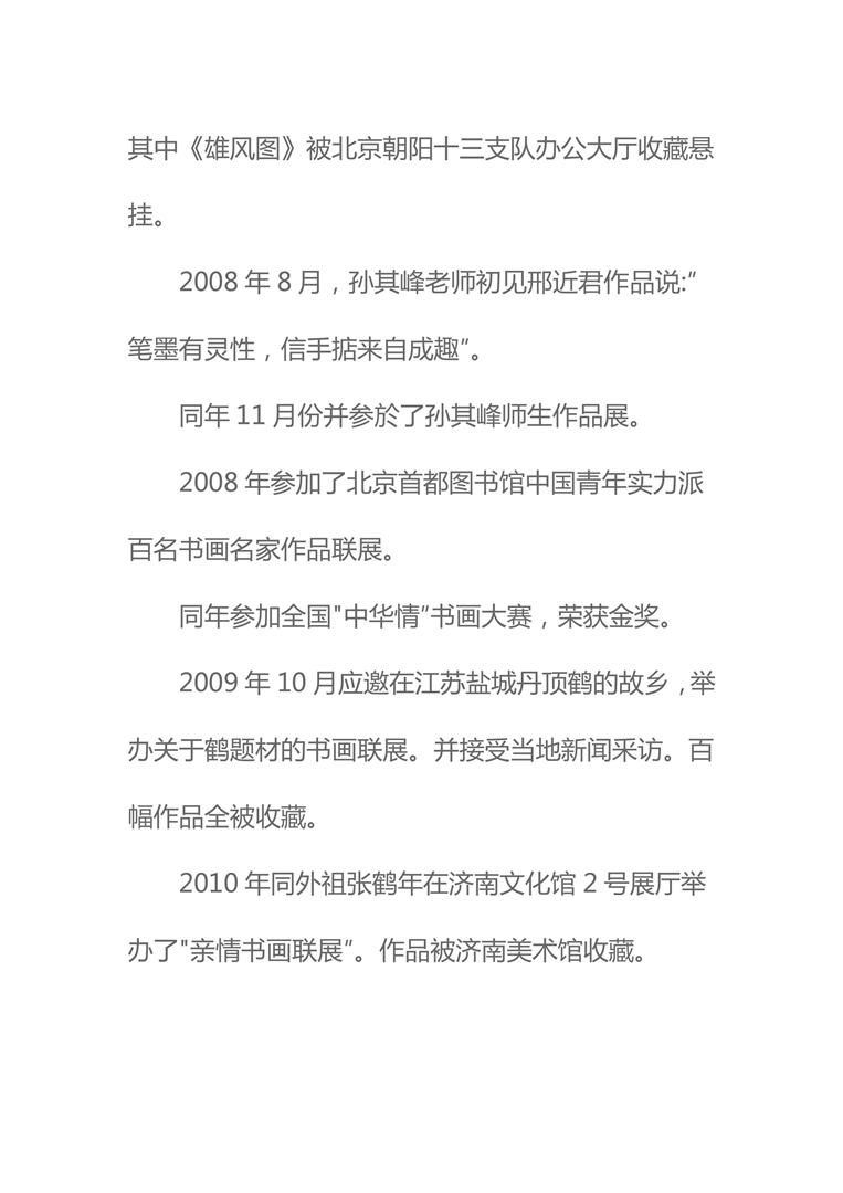 2010年同外祖张鹤年在济南文化馆2号展厅举办了"亲情书画联展″。作品被济南美术馆收藏。