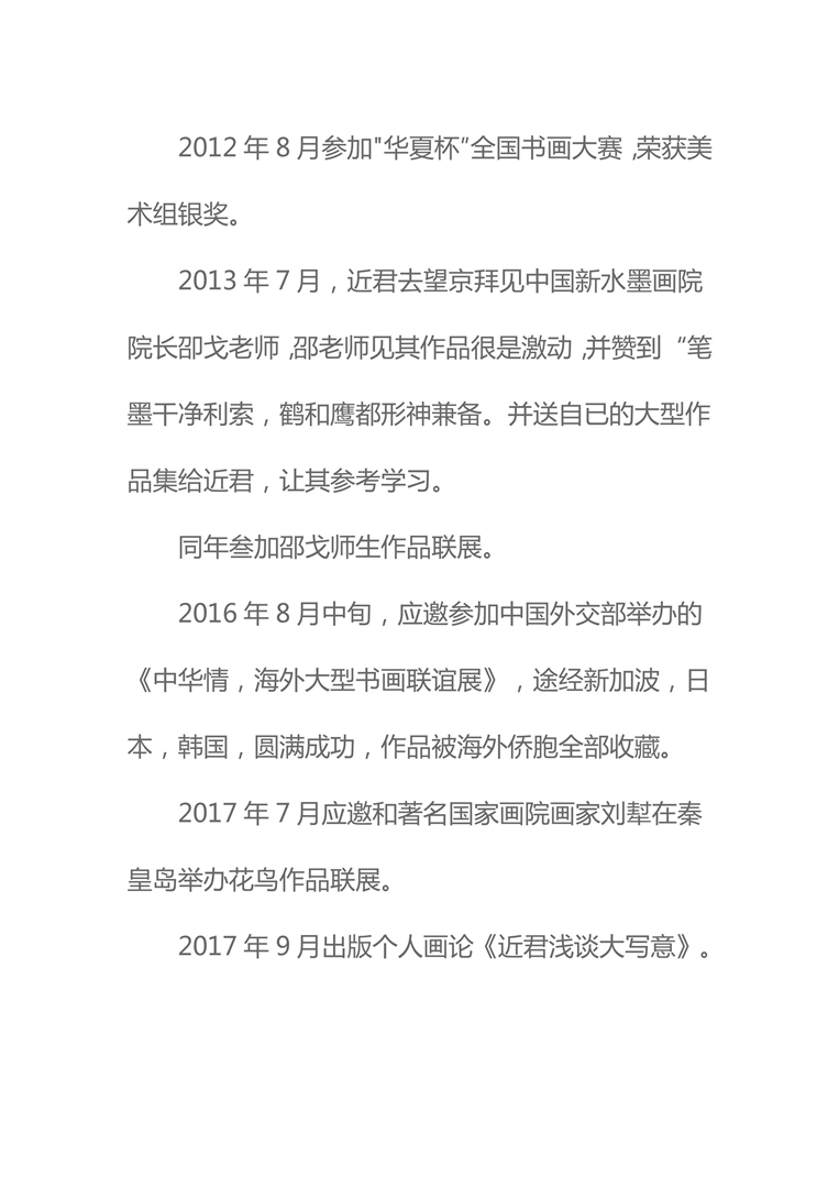 2013年7月,近君去望京拜见中国新水墨画院院长卲戈老师,邵老师见其作品很是激动,并赞到“笔墨干净利索,鹤和鹰都形神兼备。并送自已的大型作品集给近君,让其参考学习。