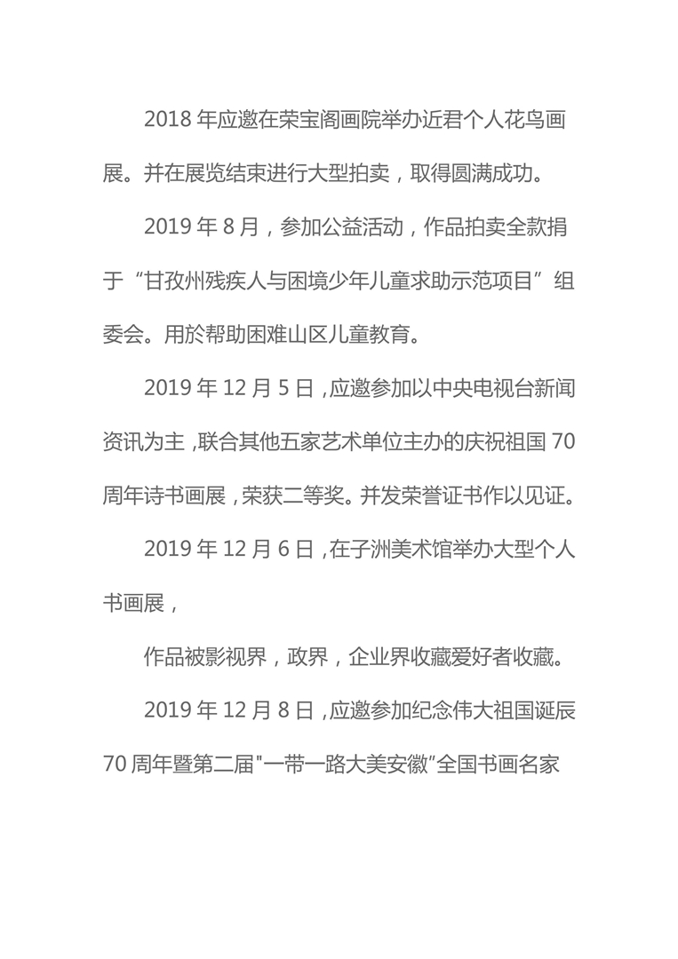 2018年应邀在荣宝阁画院举办近君个人花鸟画展。并在展览结束进行大型拍卖,取得圆满成功。