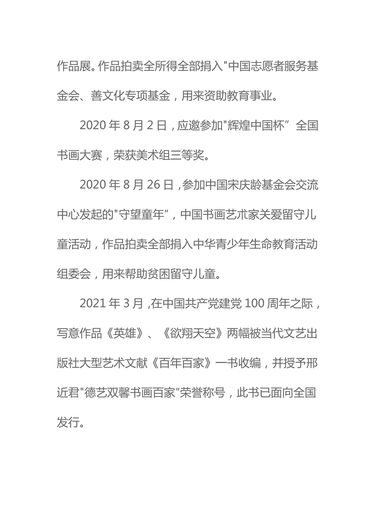 2021年3月,在中国共产党建党100周年之际,写意作品《英雄》、《欲翔天空》两幅被当代文艺出版社大型艺术文献《百年百家》一书收编,并授予邢近君"德艺双馨书画百家″荣誉称号,此书已面向全国发行。