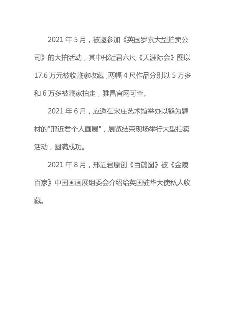 2021年5月,被邀参加《英国罗素大型拍卖公司》的大拍活动,其中邢近君六尺《天涯际会》图以17.6万元被收藏家收藏,两幅4尺作品分别以5万多和6万多被藏家拍走,雅昌官网可查。